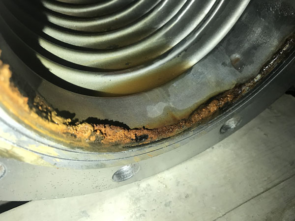 2018年6月1日上午客户到我厂带了*台DN50波纹补偿器,不锈钢波纹与法兰焊接处出现腐蚀漏水现象,客户说现场还有*台DN125的也出现了漏水情况,说要带*个去现场更换,我厂工作人员带了*台DN125的波纹补偿器当天赶到上海华山医院工地现场,当天下午1点上班后与现场人员*起来到天花板上面的管线现场,并把DN125漏水的那台进行拆卸更换,在拆卸过程中,我厂工作人员全场在场,并拍了*些现场照片(见附件),DN125拆下来后发现也是不锈钢波纹与法兰焊接处腐蚀漏水。现场使用的管线为全铜管线。现场使用的垫片为四氟垫片。